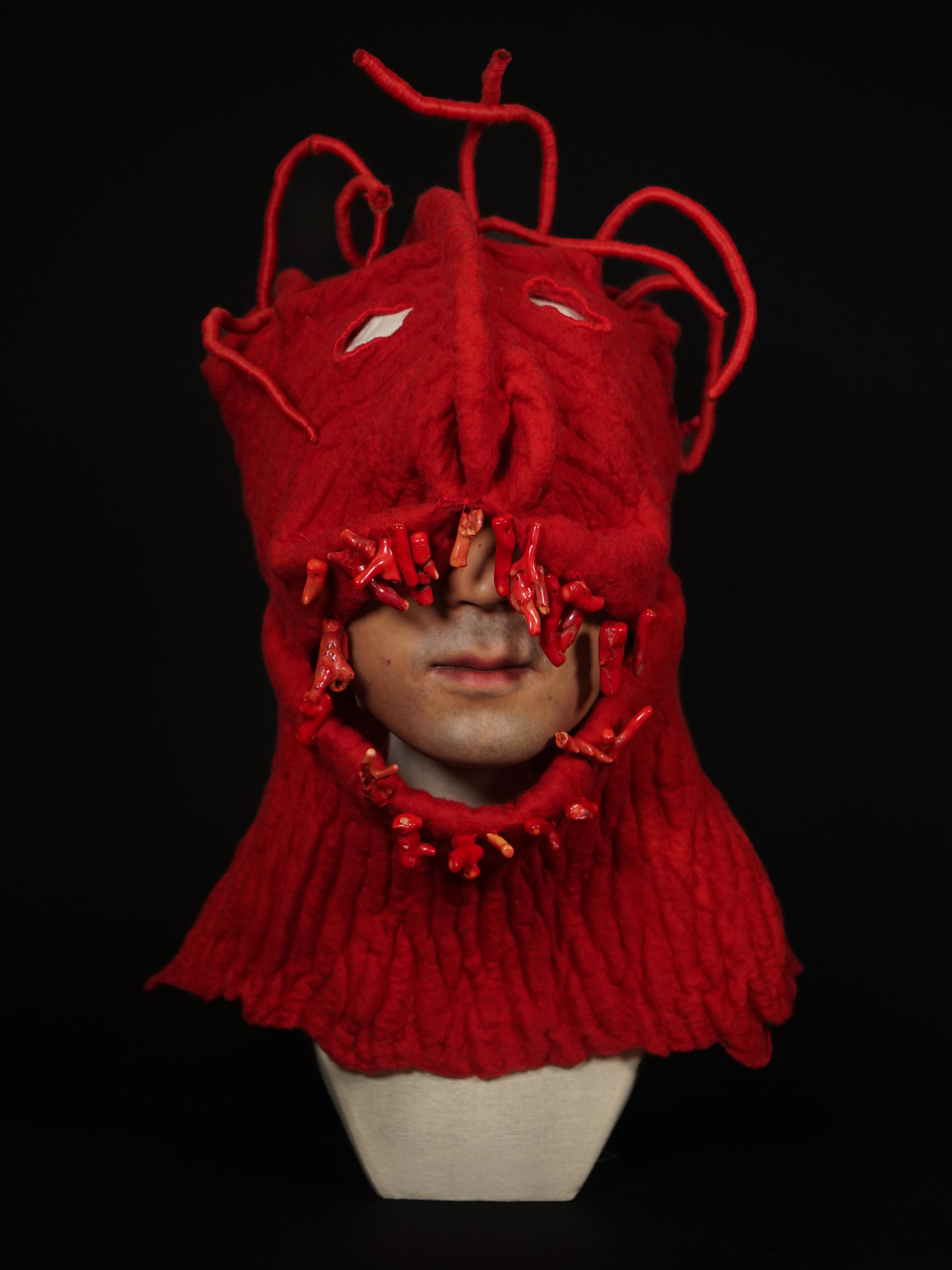 medium: merino wool, waxed polyester, coral stone