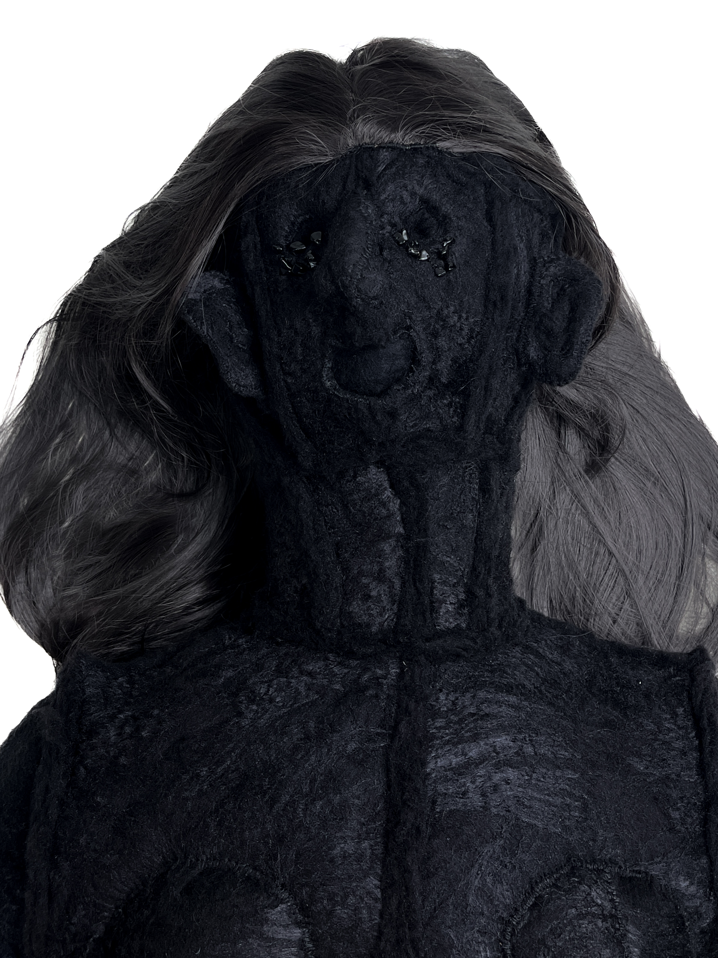 medium: merino wool, tussah silk, obsidian stone, filling, synthetic hair